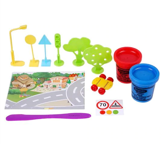 צרו עיירה קטנה עם הבצק מבית קריולה. הערכה מכילה אביזרים מפלסטיק, אותם מעצבים בעזרת הבצק המצורף. הבצקים לא ניתנים לאכילה! הסט מכיל שני תמרורים, רמזור, מנורת רחוב, 2 עצים, בסיס של רכב, כלי לעיצוב הצורות, משטח עם רקע של עיירה, גליון מדבקות ושתי חבילות בצקים בצבע אדום וכחול. הבצקים של קריולה רכים, צבעוניים ועשויים מחומר שאינו רעיל שמוכן לשימוש הישר מהחבילה. הבצק נשטף בקלות מרוב המשטחים. הבצק עשוי כך שלא יתקשה עם הזמן וישאר רך ונעים.