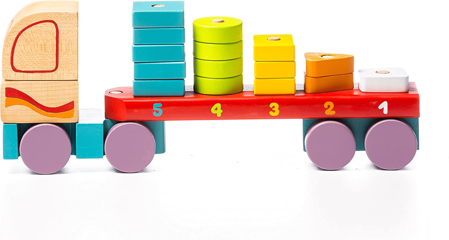 הערכה מכילה משאית מעץ ו15 חלקים: חמישה חלקים מרובעים, ארבעה עגולים, שלושה ריבועים קטנים, שני משולשים עם פינות מעוגלות – כל קבוצה בצבע אחר. הילדים צריכים לסדר את הצורות הזהות אחת על גבי השנייה. הסידור דורש הבדלה בין הצורות והצבעים השונים. המשחק מלמד גם מספרים – המספרים רשומים על המשאית לפי הסדר וכמות הצורות הזהות תואמות למספר המצויין בטור שלהן. משחק נהדר המלמד מגוון מיומנויות שונות ומעוצב בצורה יפה ועדינה.