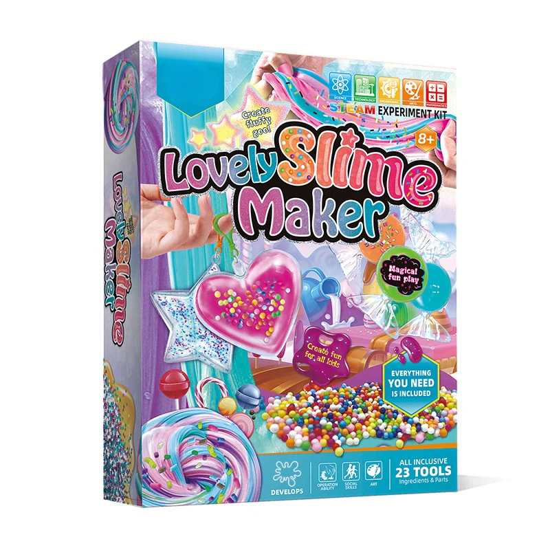 מעל 10 סליים, תבניות, כדורי סוכריות ואביזרים מוכנים מראש בצבעי הקשת, ליצירת מגוון סוגי סליים, כולל סליים נצנצים, רכים, עכורים, שקוף, מוקצף, זוהר בחושך וחמאה.