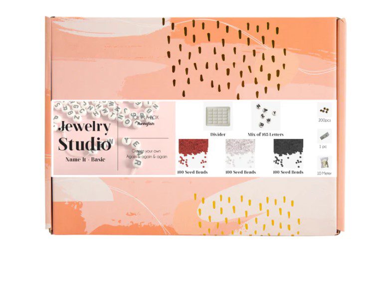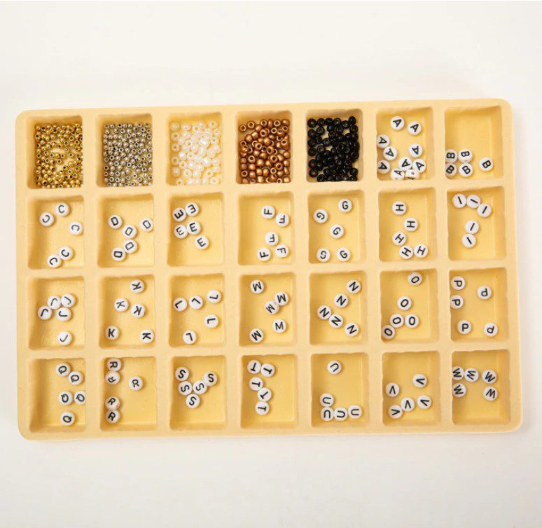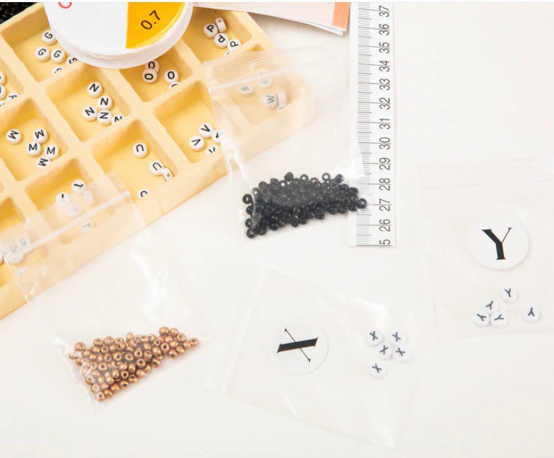 חרוזים: 165 חרוזי אותיות שחורות – מגוון של 300 חרוזים צבעוניים – 100 חרוזים כסופים – 100 חרוזים מוזהבים