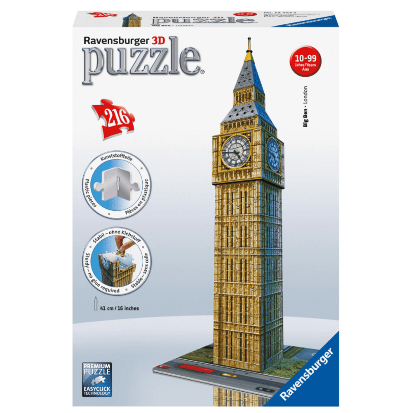 פאזל תלת מימד – הביג בן מבית Ravensburger הגרמנית. הרכיבו פאזל גדול ומרהיב ביופיו. אתגרו את עצמכם עם פאזל תלת מימד מיוחד. בפאזל 216 חלקים וגובהו 41 ס"מ