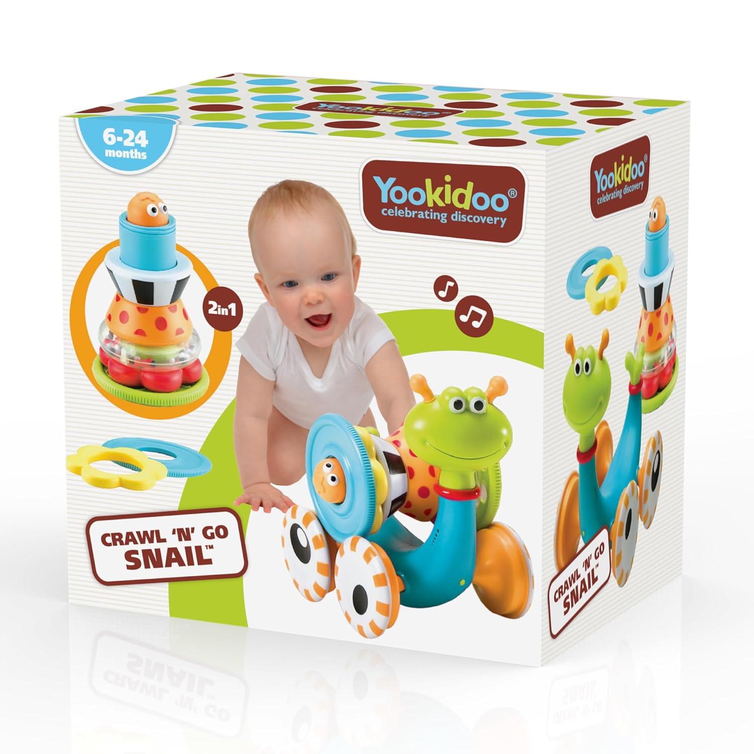 עודדו זחילה עם חילזון זה, המופעל על ידי סוללה, שמתגלגל, מנגן מוזיקה ומסובב את הקונכייה שלו תוך כדי תנועה ומסובב את ראשו מצד לצד.