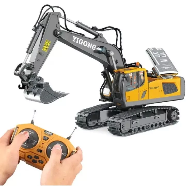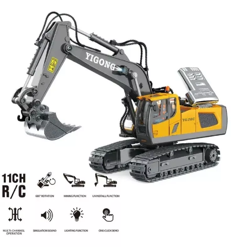 מחפרון מקצועי נשלט על שלט. מבצע פעולות ומשמיע קולות של דחפור אמיתי.