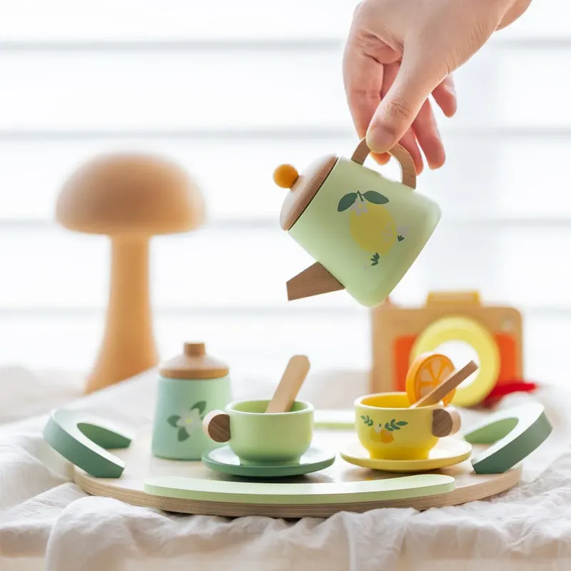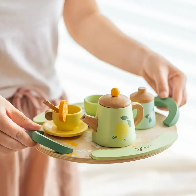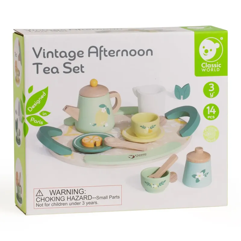 כולל 2 ערכות של ספלי תה וצלחות, קנקן תה, 2 טעמי תה, כפית, מגש ועוד (מכיל 14 חלקים)