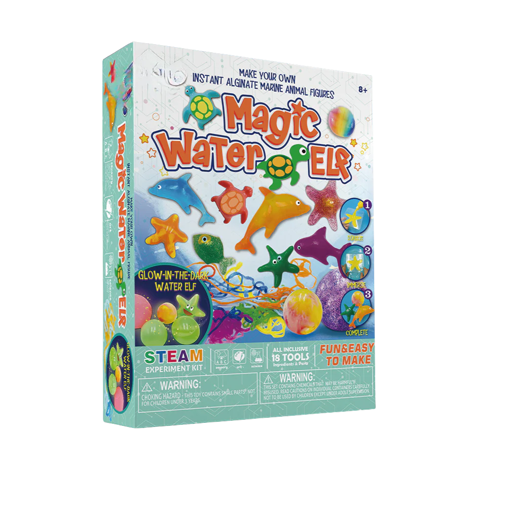 ערכת יצירה בת 18 חלקים – כוללת תבניות, מים קסומים צבעוניים, אבקת ג'ל, כלים ומעל 10 עיצובים מהנים של יצורי ים ליצירתיות אינסופית.