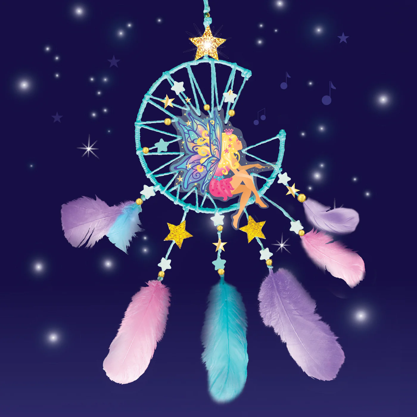 תכולה: 1 חישוק בצורת ירח, חוט זוהר בחושך, 10 חרוזים זוהרים, 1 קישוט פיה, 1 דף מדבקות, 6 כרטיסיות קרטון, 1 דף עיגולי דבק דו-צדדי, 11 חרוזים זהובים, 8 נוצות צבעוניות ו-1 קופסת אחסון למזכרת. הוראות מפורטות בפנים.
